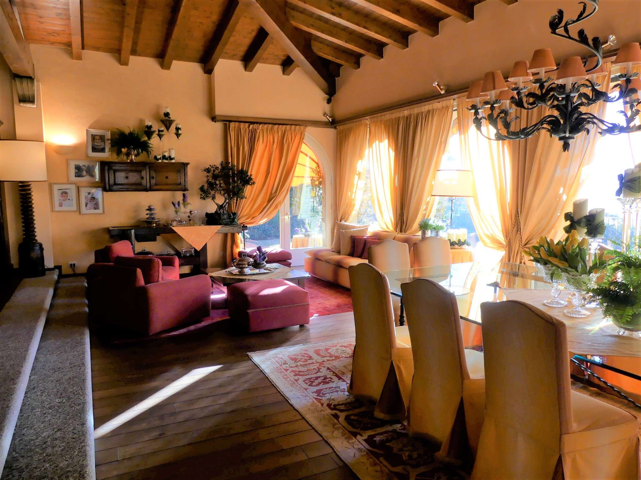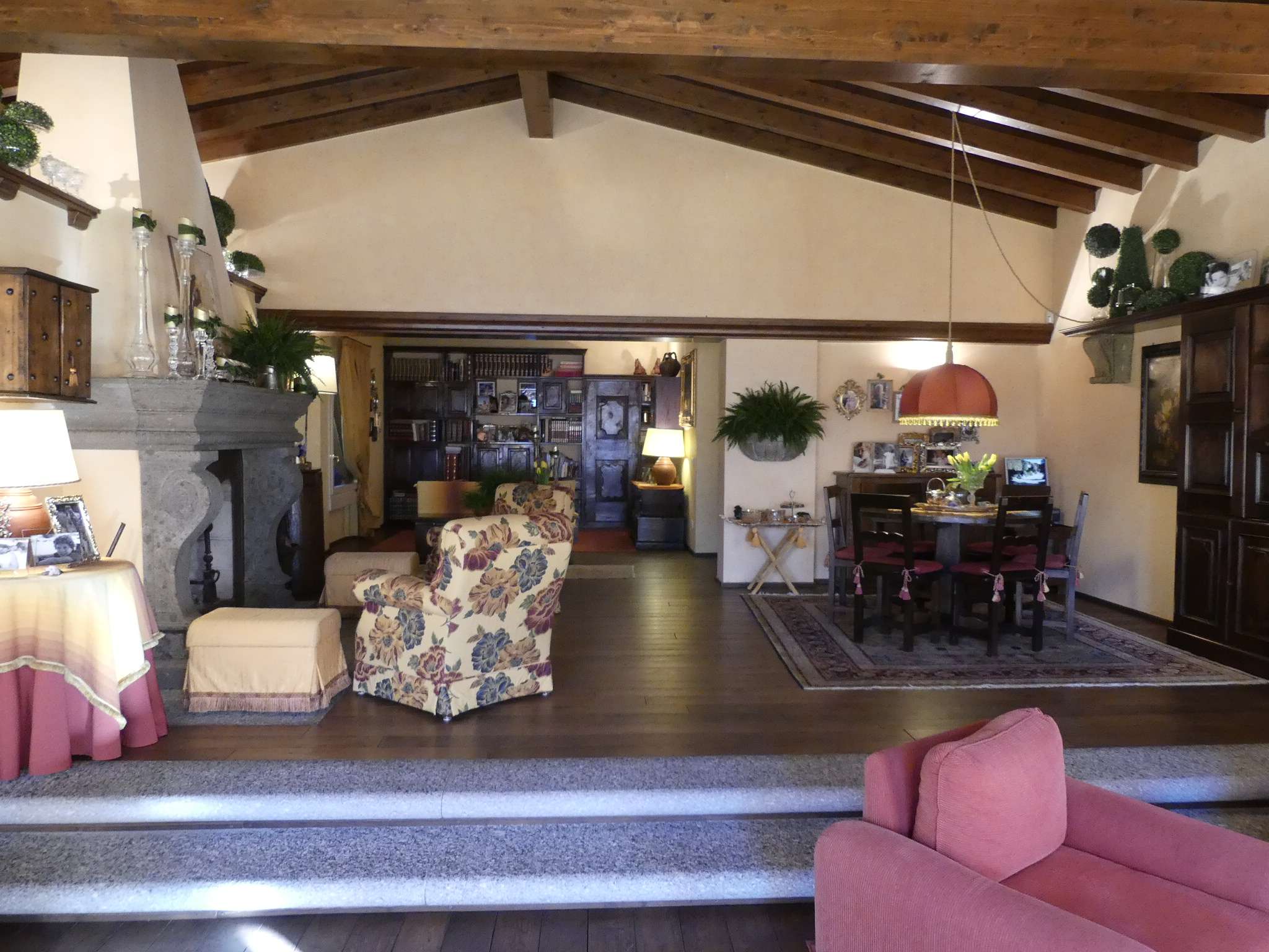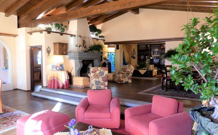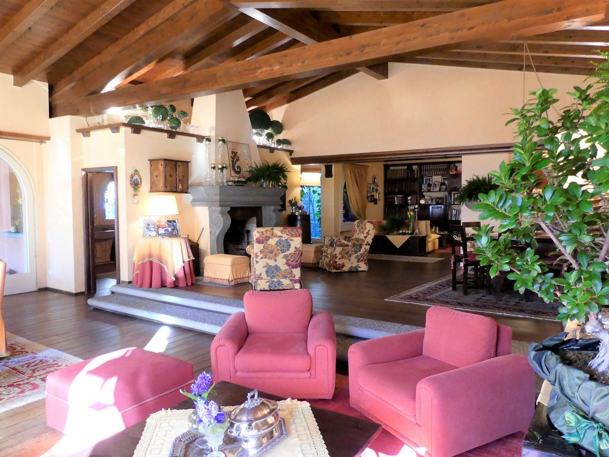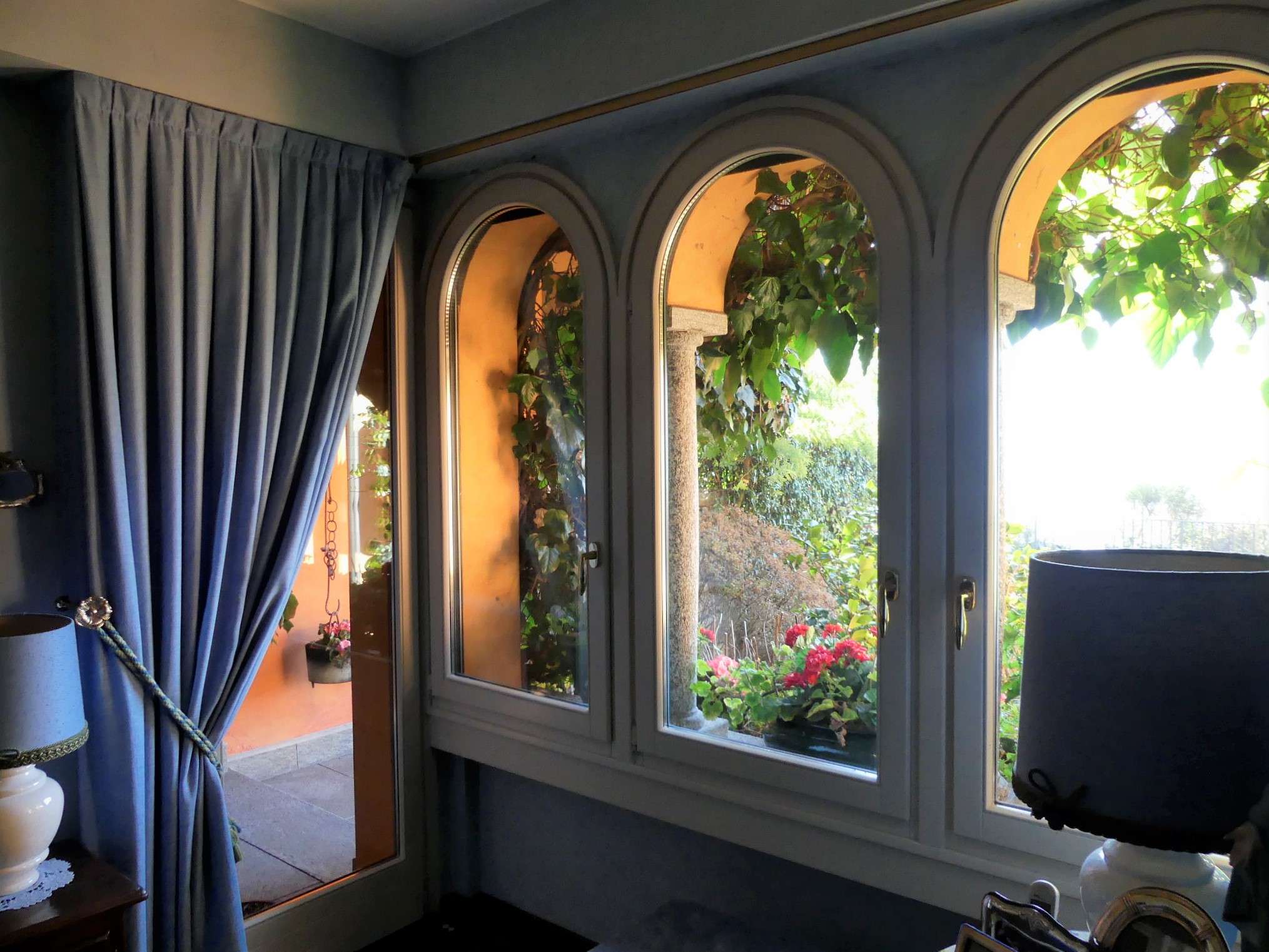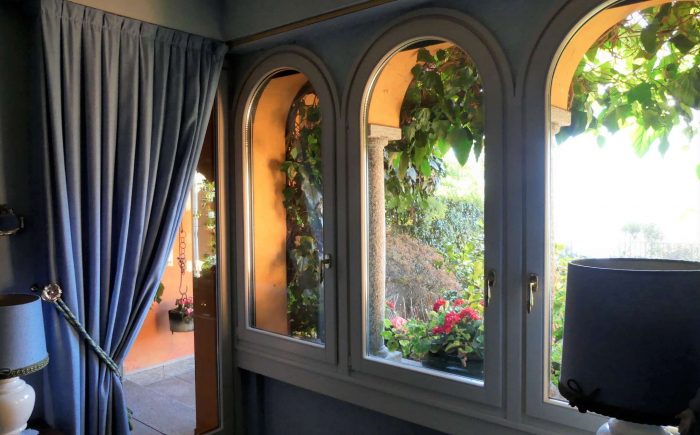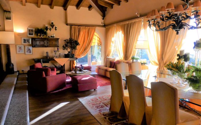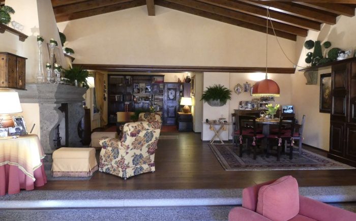 Die videoüberwachte Einfahrt mit elektrischem Tor hat einen großen Außenstellplatz vor dem Haus sowie weitere Parkmöglichkeiten im Innenhof. Das großzügige Haupthaus mit ca. 270 m² bietet eine Bibliothek, eine gemütliche Kaminecke und einen stilvollen Wohn- und Essbereich. Über zwei große Flügeltüren aus Glas gehen Sie auf die überdachte Terrasse und in den Garten, um den Blick auf den Luganer See und in die umliegende Bergregion zu genießen.