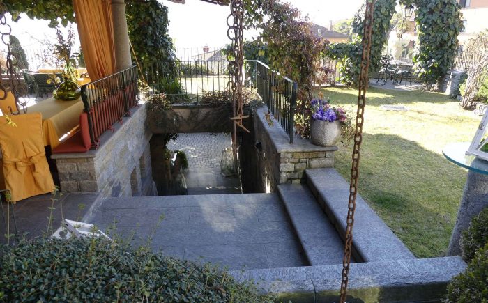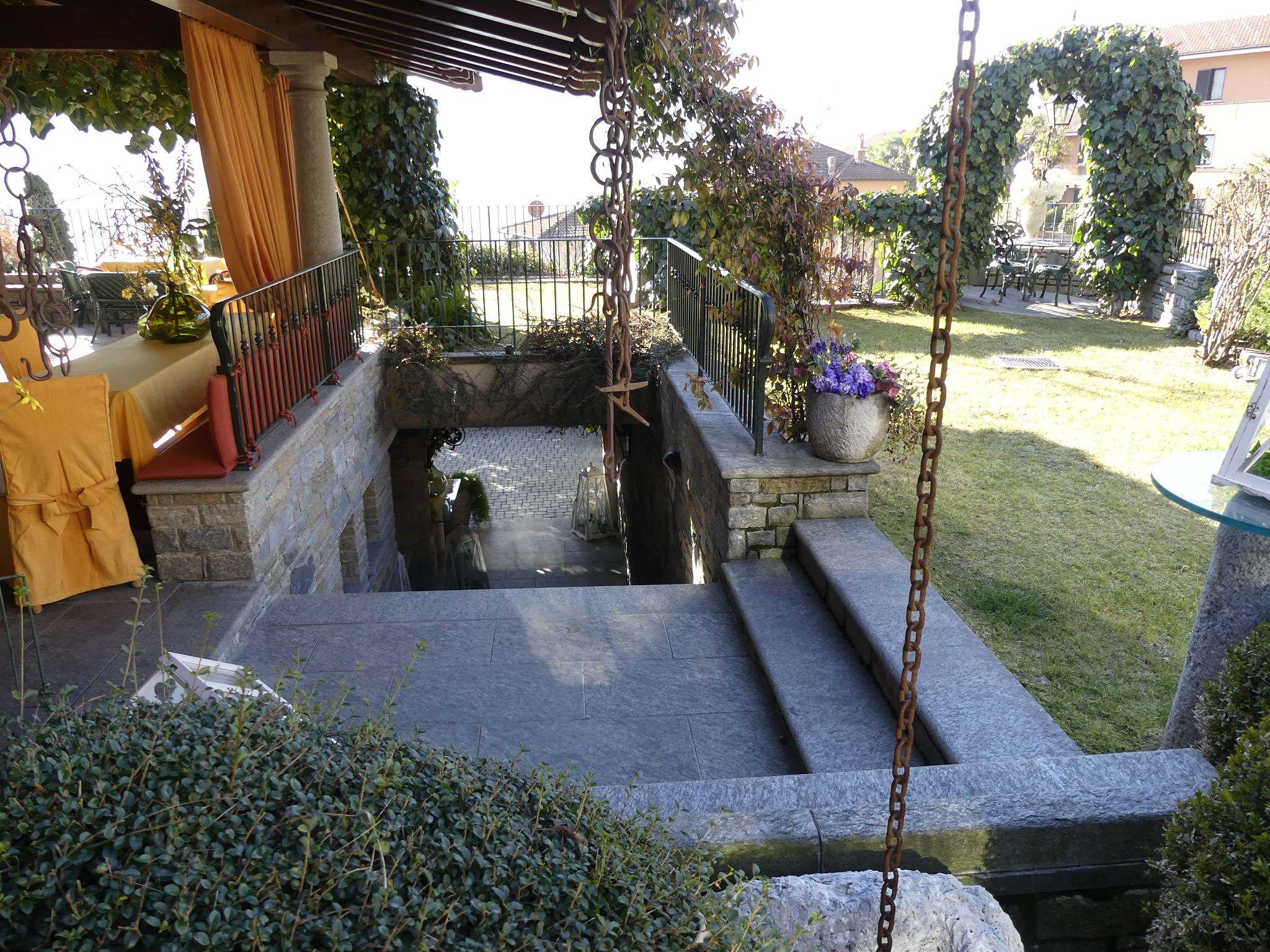 Separate Sitzecke mit Eisengeländer und rundem Granitboden