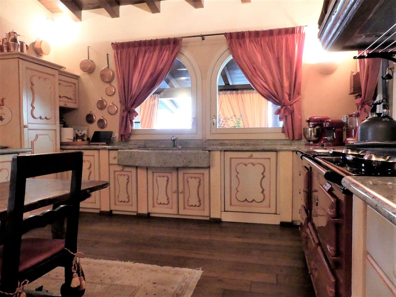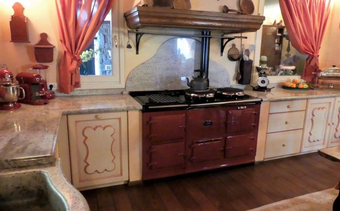 Einbauküche mit englischen AGA Herd (4 Öfen und 2 Kochplatten), Geschirrspüler, Kühlschrank, Spüle in gemeißeltem Stein, alle Möbel passend zum Stil